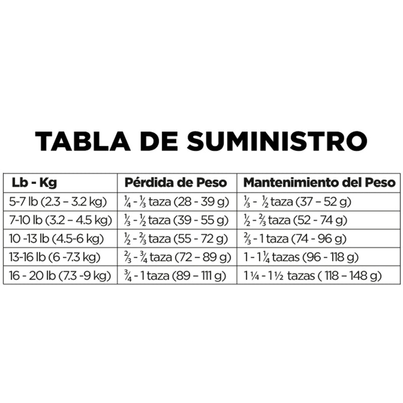 Pollo deshuesado, arvejas, harina de pollo, papas, garbanzos, fibra de arveja, alfalfa secada al sol, linaza, grasa de pollo (conservada con tocoferoles mixtos), sabor natural, cáscara de psyllium, cartílago de pollo (una fuente sulfato de condroitina), manzanas, tomate, zanahorias, raíz de achicoria seca, cloruro de colina, vitaminas (suplemento de vitamina E, niacina, L-ascorbil-2-polifosfato (una fuente de vitamina C), mononitrato de tiamina, biotina, suplemento de vitamina A, pantotenato de calcio, betacaroteno, riboflavina, clorhidrato de piridoxina, suplemento de vitamina B12, suplemento de vitamina D3, ácido fólico), minerales (proteinato de zinc, sulfato ferroso, óxido de zinc, proteinato de hierro, sulfato de cobre, selenita de sodio, proteinato de cobre, proteinato de manganeso, MnO óxido de manganeso, yodato de calcio), producto de fermentación de Enterococcus faecium deshidratado, producto de fermentación de Lactobacillus acidophilus deshidratado, taurina, sal, DL-metionina, mejillones de labios verdes, L-carnitina, extracto de yucca schidigera, romero deshidratado.