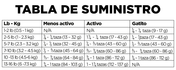 Salmón deshuesado, bacalao deshuesado, harina de salmón, harina de arenque, arvejas, lentejas, huevo entero deshidratado, papas, grasa de pollo (conservada con tocoferoles mixtos), sabor natural, trucha deshuesada, tapioca, aceite de salmón, raíz de achicoria seca, arándanos rojos, manzanas, zanahorias, fosfato dicálcico, producto de fermentación de Lactobacillus acidophilus deshidratado, producto de fermentación de Enterococcus faecium deshidratado, ácido fosfórico, cloruro de colina, cloruro de potasio, sal, vitaminas (suplemento de vitamina A, suplemento de vitamina D3, suplemento de vitamina E, niacina, L-ascorbil-2- polifosfato (una fuente de vitamina C), mononitrato de tiamina, pantotenato de calcio, riboflavina, clorhidrato de piridoxina, betacaroteno, ácido fólico, biotina, suplemento de vitamina B12), minerales (proteinato de zinc, proteinato de hierro, proteinato de cobre, óxido de zinc, proteinato de manganeso, sulfato de cobre, yodato de calcio, sulfato ferroso, MnO óxido de manganeso, selenita de sodio), extracto de la fermentación del Aspergillus oryzae seco, extracto de la fermentación del Bacillus subtilis seco, DL-metionina, taurina, extracto de yucca schidigera, romero deshidratado.