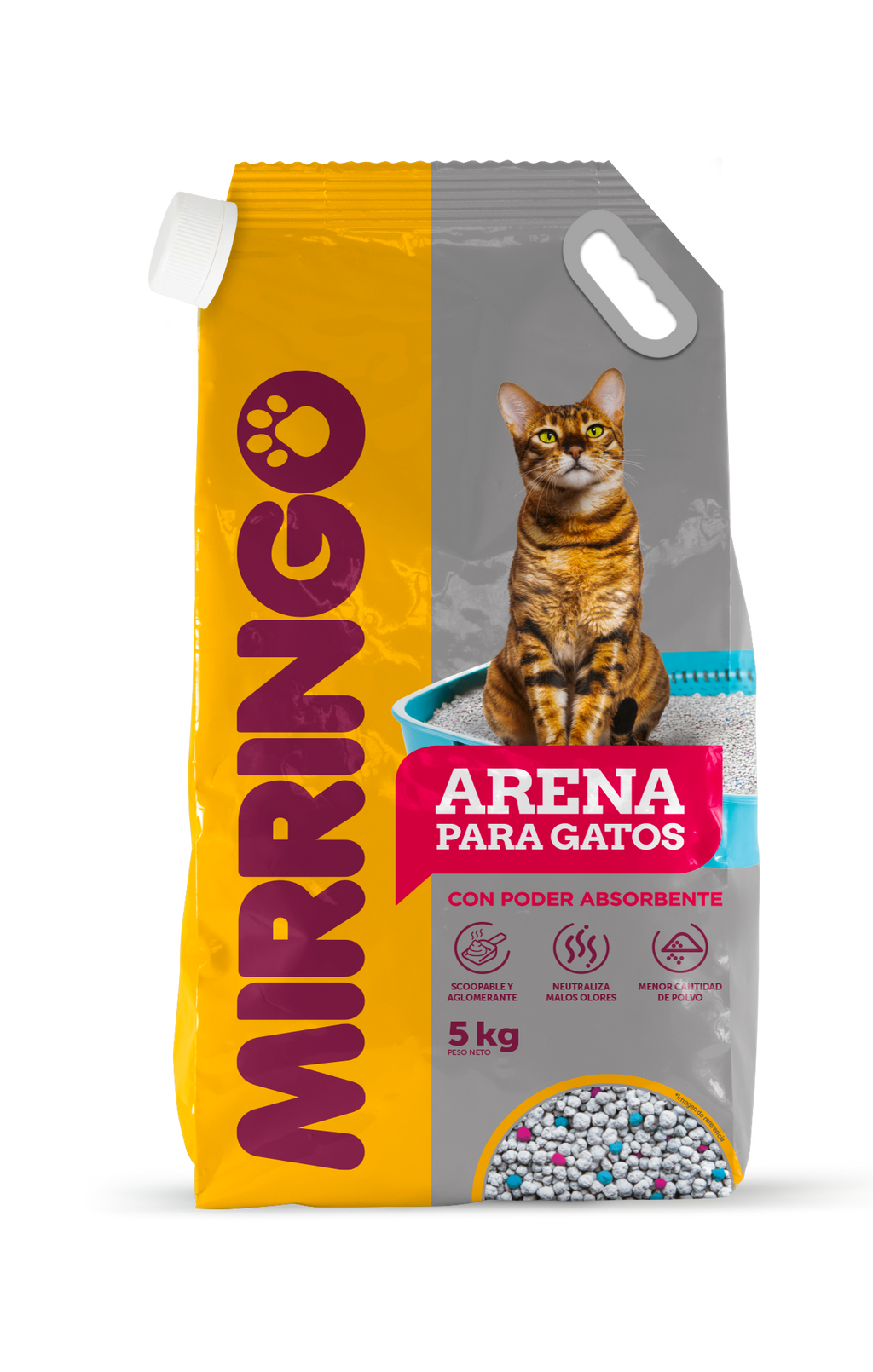 Mirringo Arena tiene una buena absorción por su poder aglomerante y menor cantidad de polvo que ayuda a la comodidad de tu gato ya tu tranquilidad. Además, contribuye a neutralizar los malos olores por su contenido de bicarbonato de sodio, posee un aroma agradable y discreto.